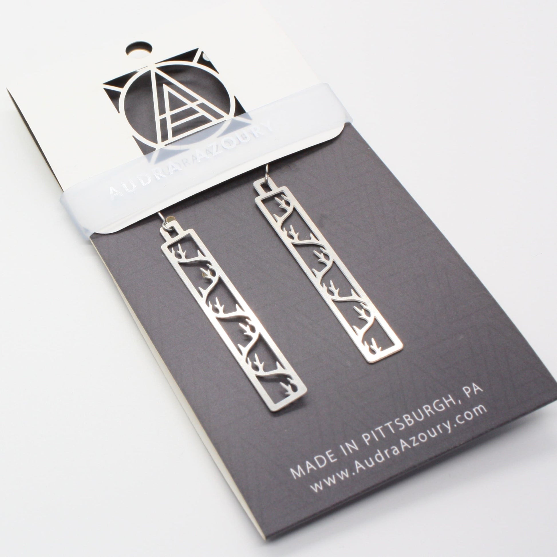 Lightweight stainless steel. Will not tarnish. Ear wires are surgical steel. Designed by Pittsburgh artist Audra Azoury.