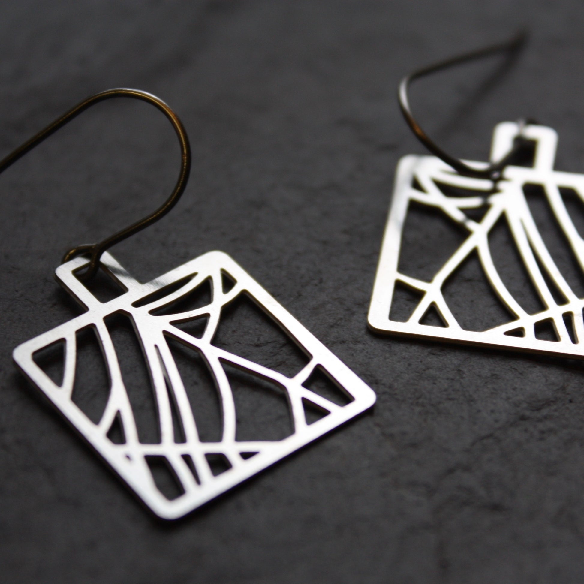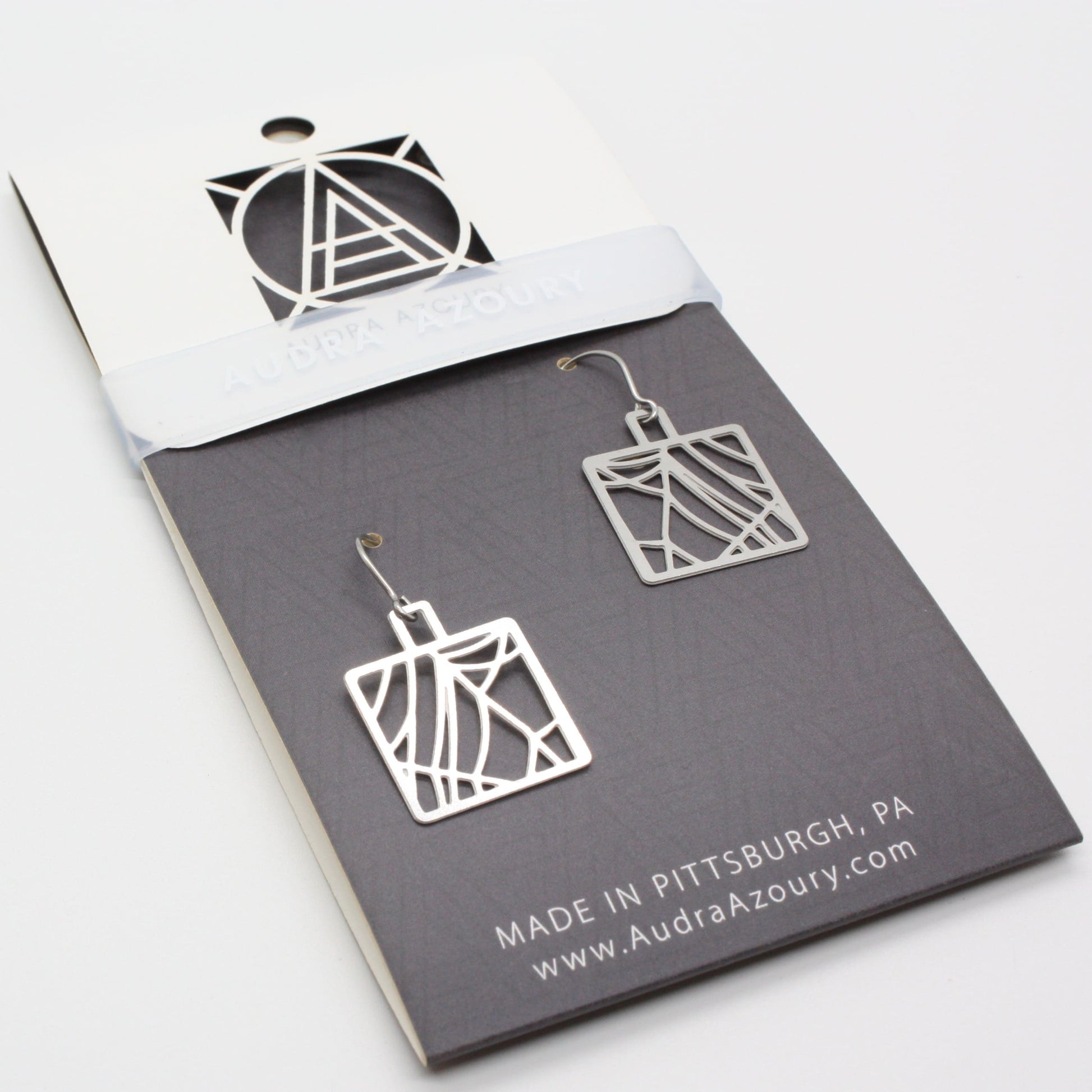 3/4" square. Lightweight stainless steel will not tarnish. Ear wires are surgical steel. Designed by Pittsburgh artist Audra Azoury.