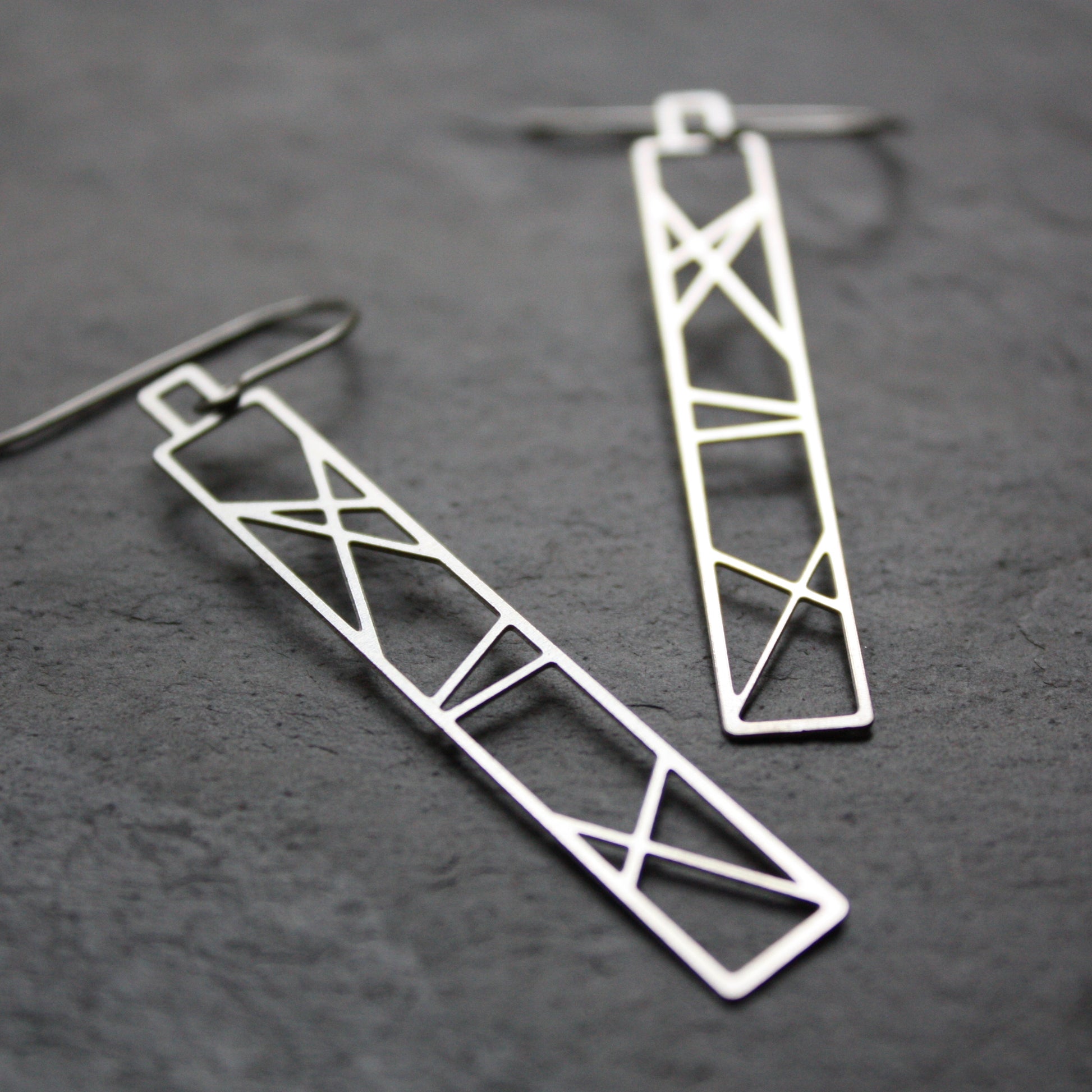 Lightweight stainless steel will not tarnish. Earring wires are surgical steel. Designed by Pittsburgh artist Audra Azoury.