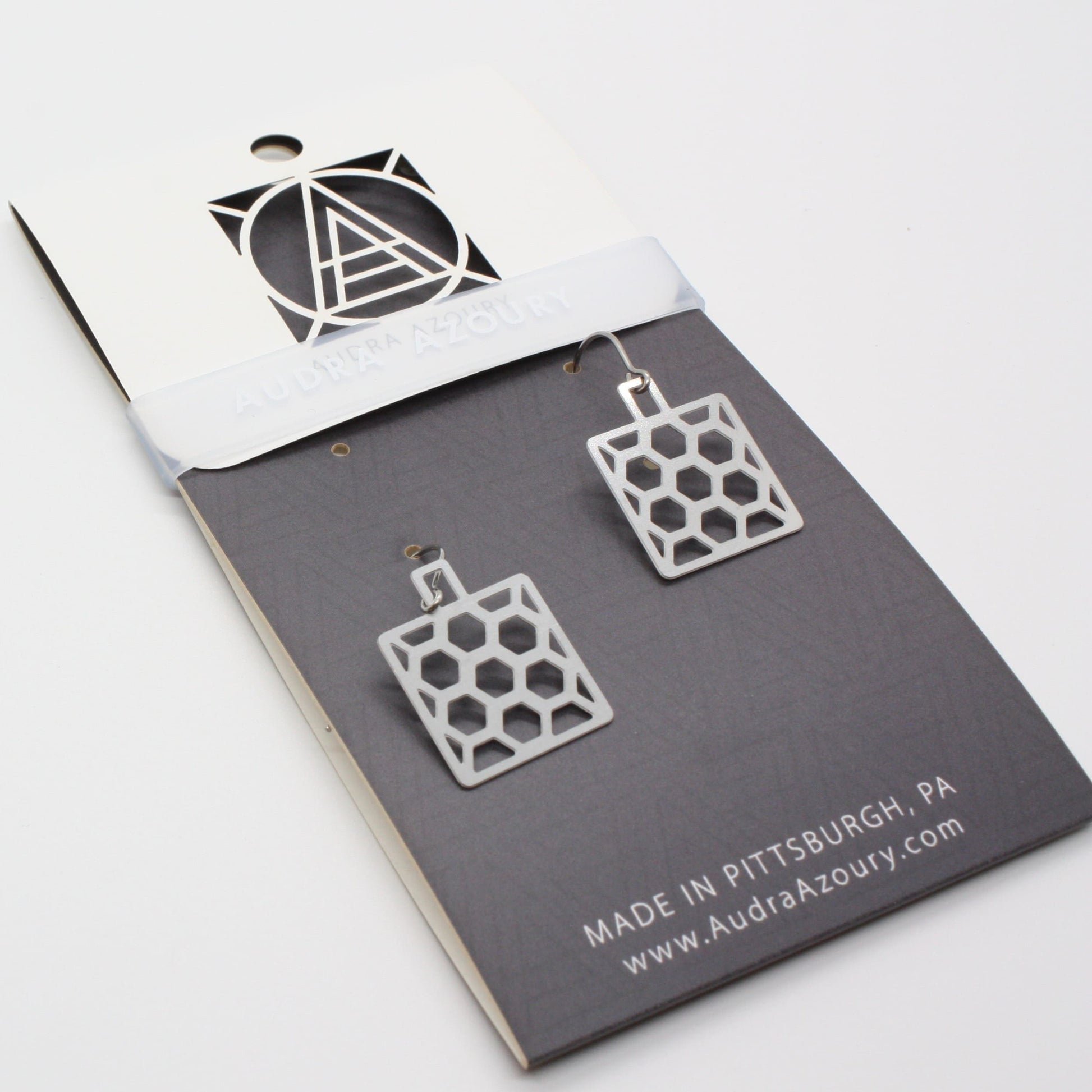 3/4" square. Lightweight stainless steel will not tarnish. Ear wires are surgical steel. Designed by Pittsburgh artist Audra Azoury.