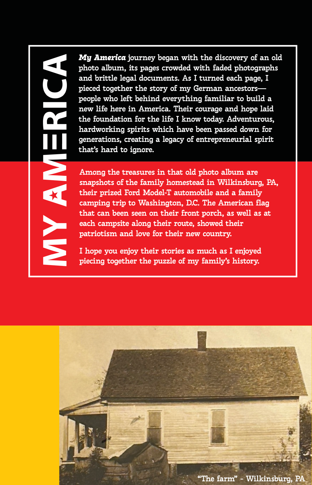 "My America journey began with the discovery of an old photo album, its pages crowded with faded photographs and brittle legal documents. As I turned each page, I pieced together the story of my German ancestors— people who left behind everything familiar to build a new life here in America. Their courage and hope laid the foundation for the life I know today. Adventurous, hardworking spirits which have been passed down for generations, creating a legacy of entrepreneurial spirit that’s hard to ignore. Among the treasures in that old photo album are snapshots of the family homestead in Wilkinsburg, PA, their prized Ford Model-T automobile and a family camping trip to Washington, D.C. The American flag that can been seen on their front porch, as well as at each campsite along their route, showed their patriotism and love for their new country. I hope you enjoy their stories as much as I enjoyed piecing together the puzzle of my family’s history."
