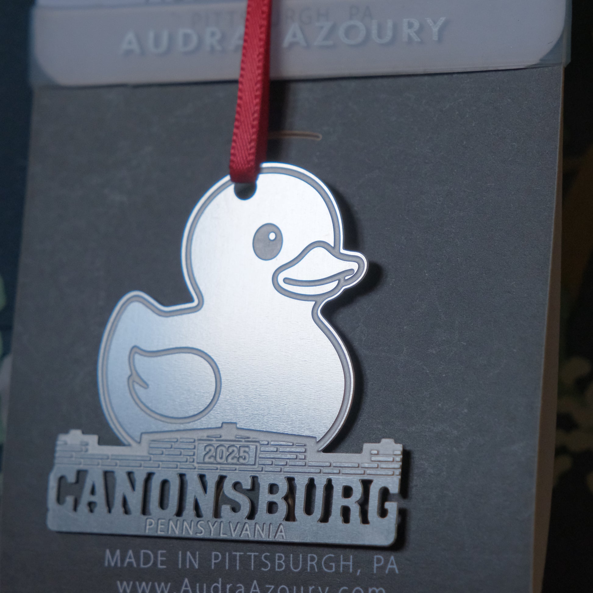 This little ornament captures all that small‑town magic — twinkly lights, hometown cheer, and that big ol’ yellow celebrity floatin’ by like it owns the place. Made fer yinz who know there’s no place like Canonsburg when the holidays hit — where the duck’s bigger than your tree and everybody’s got a smile n’at!