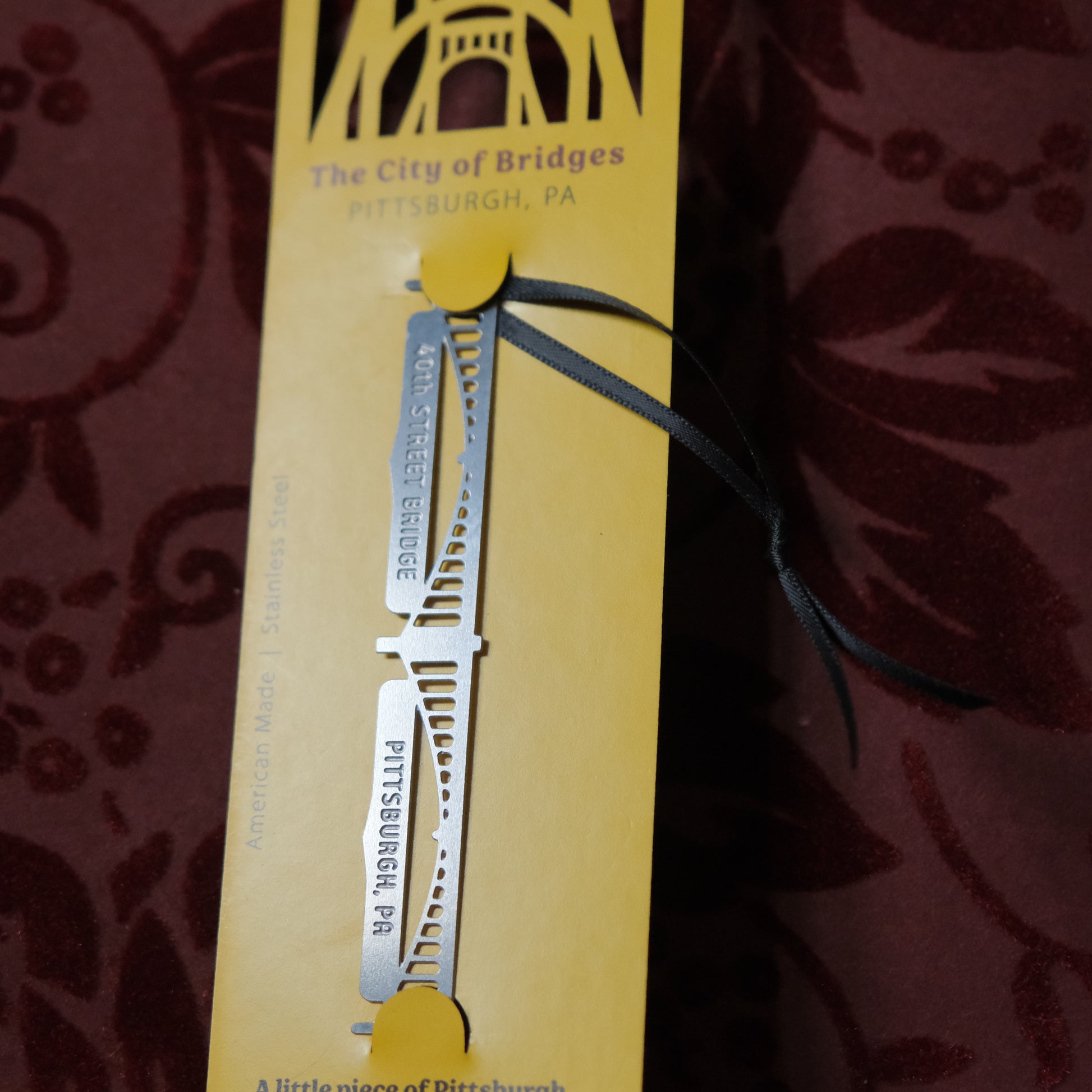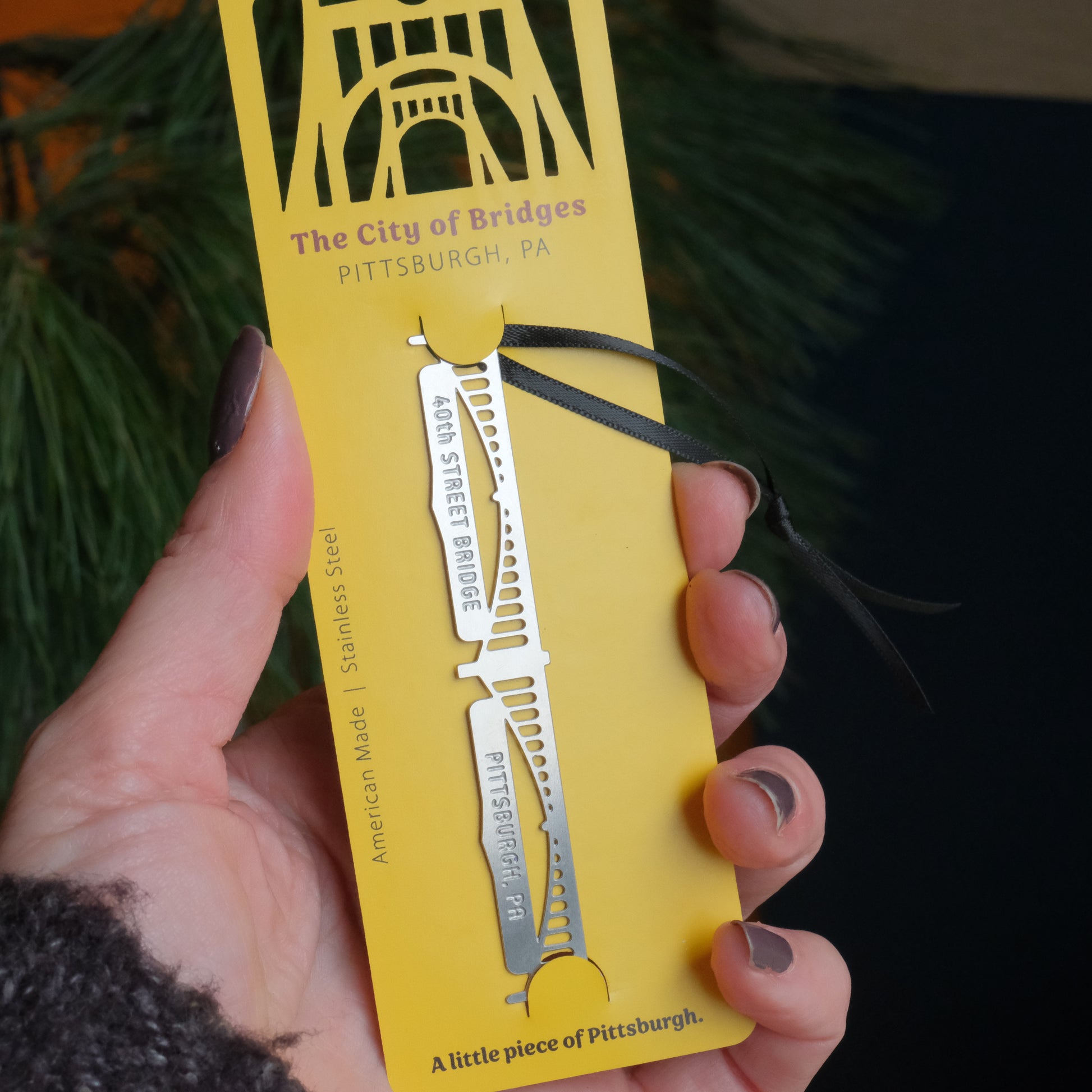 1" x 3 1/2" light weight stainless steel ornaments will not tarnish or break. Designed by Pittsburgh artist Audra Azoury.