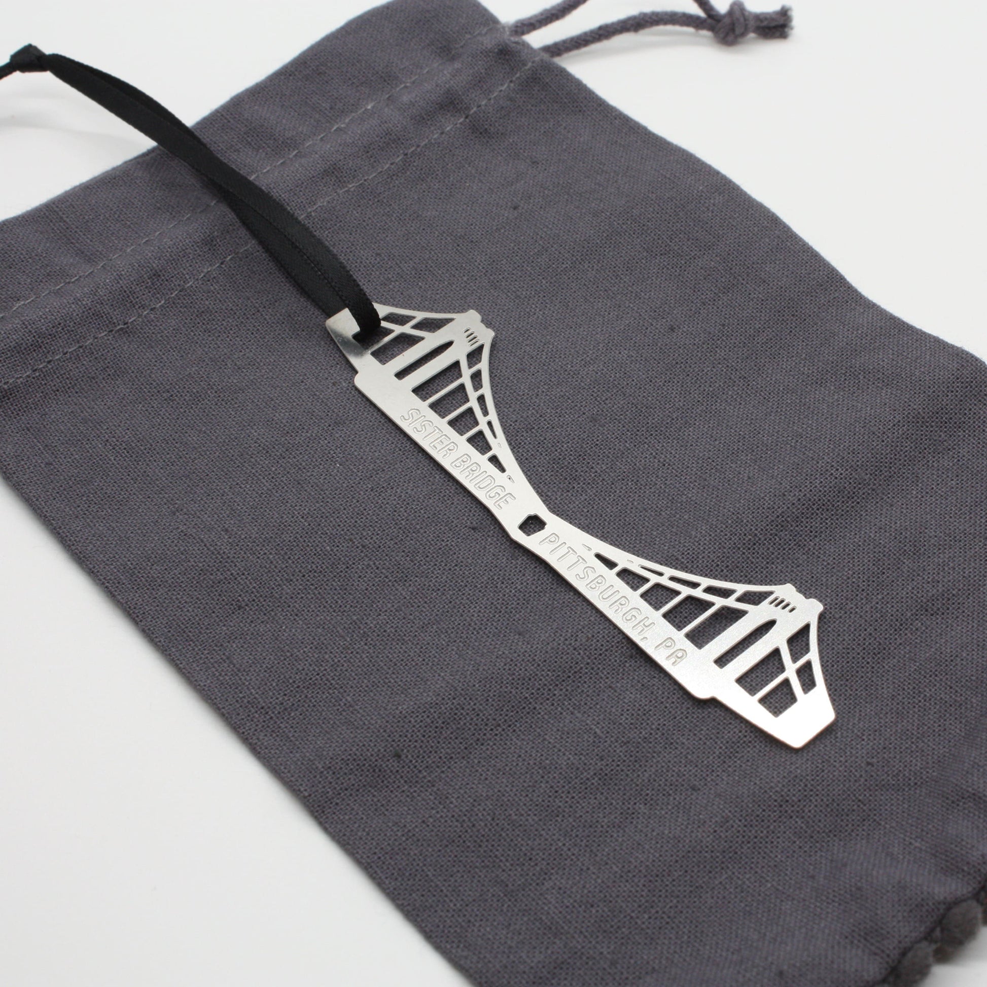 1" x 3 1/2" light weight stainless steel ornaments will not tarnish or break. Designed by Pittsburgh artist Audra Azoury.
