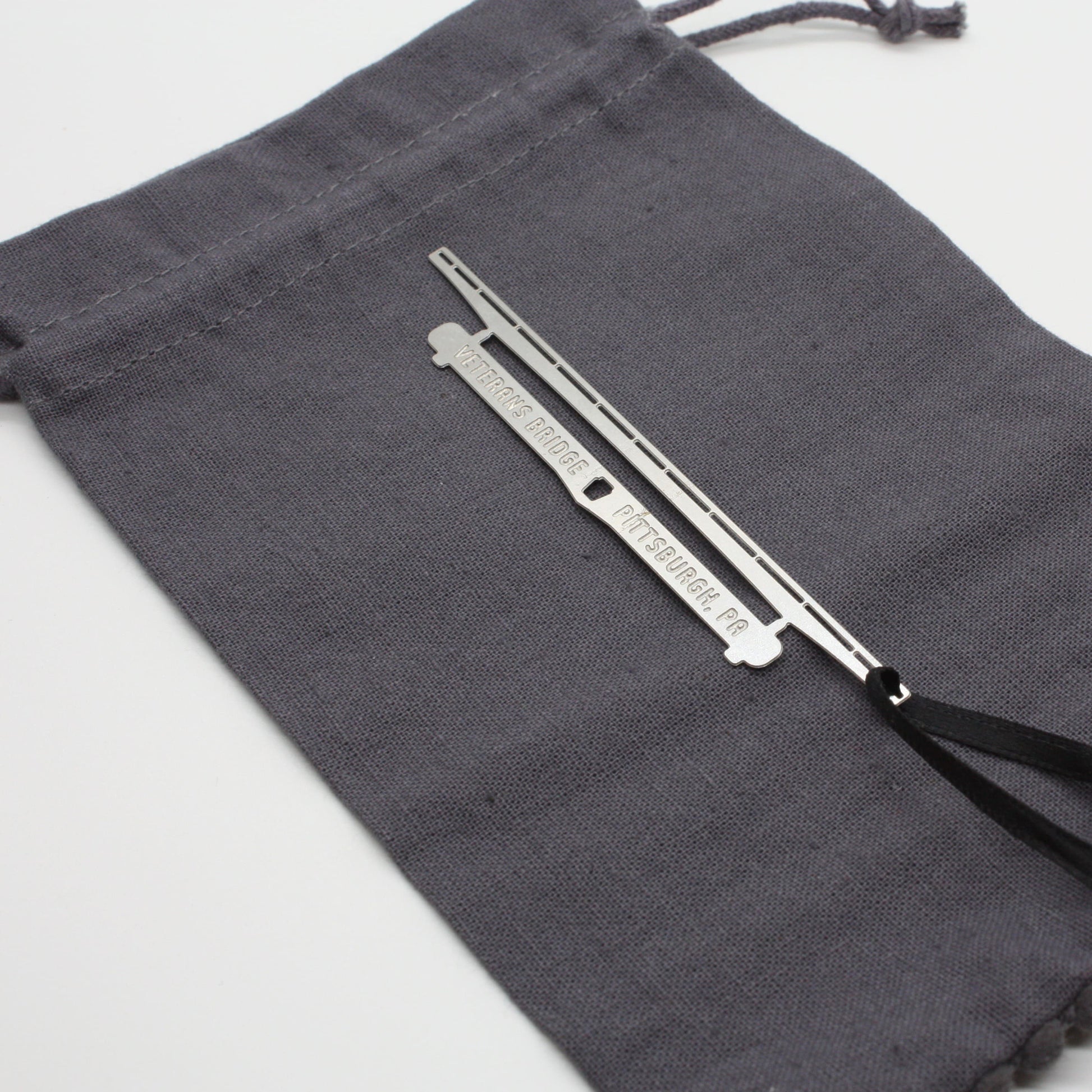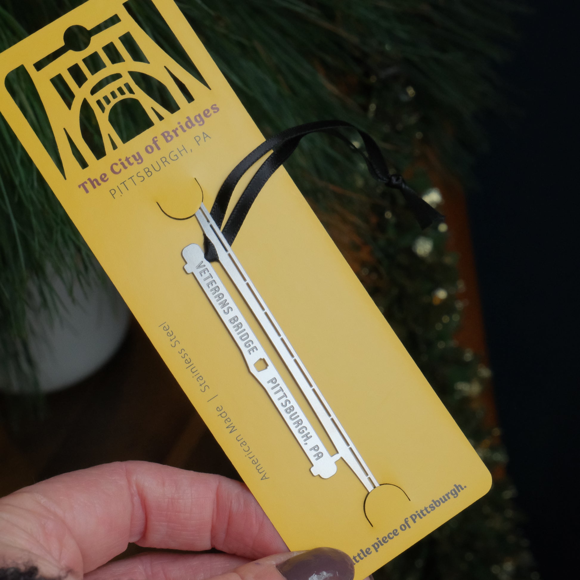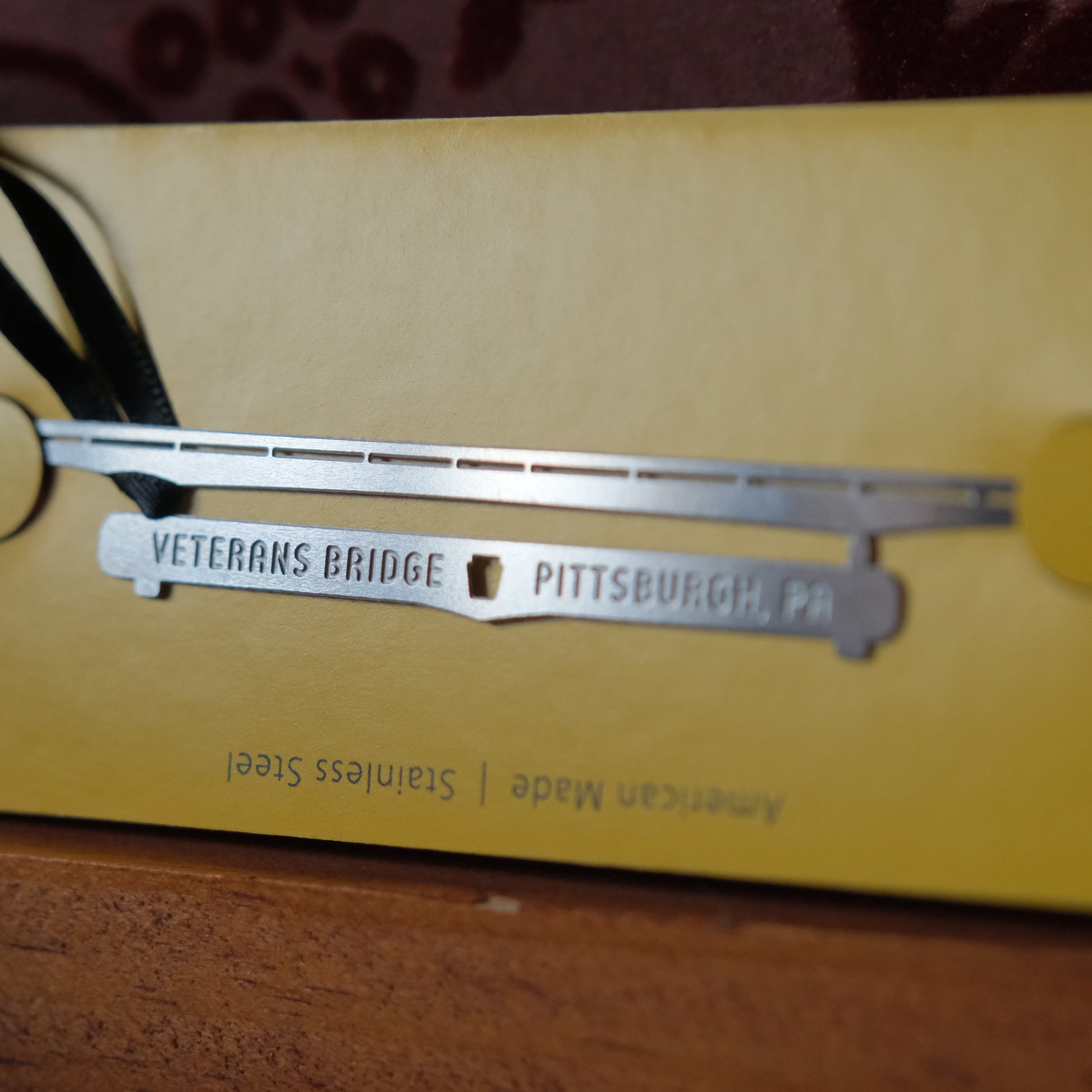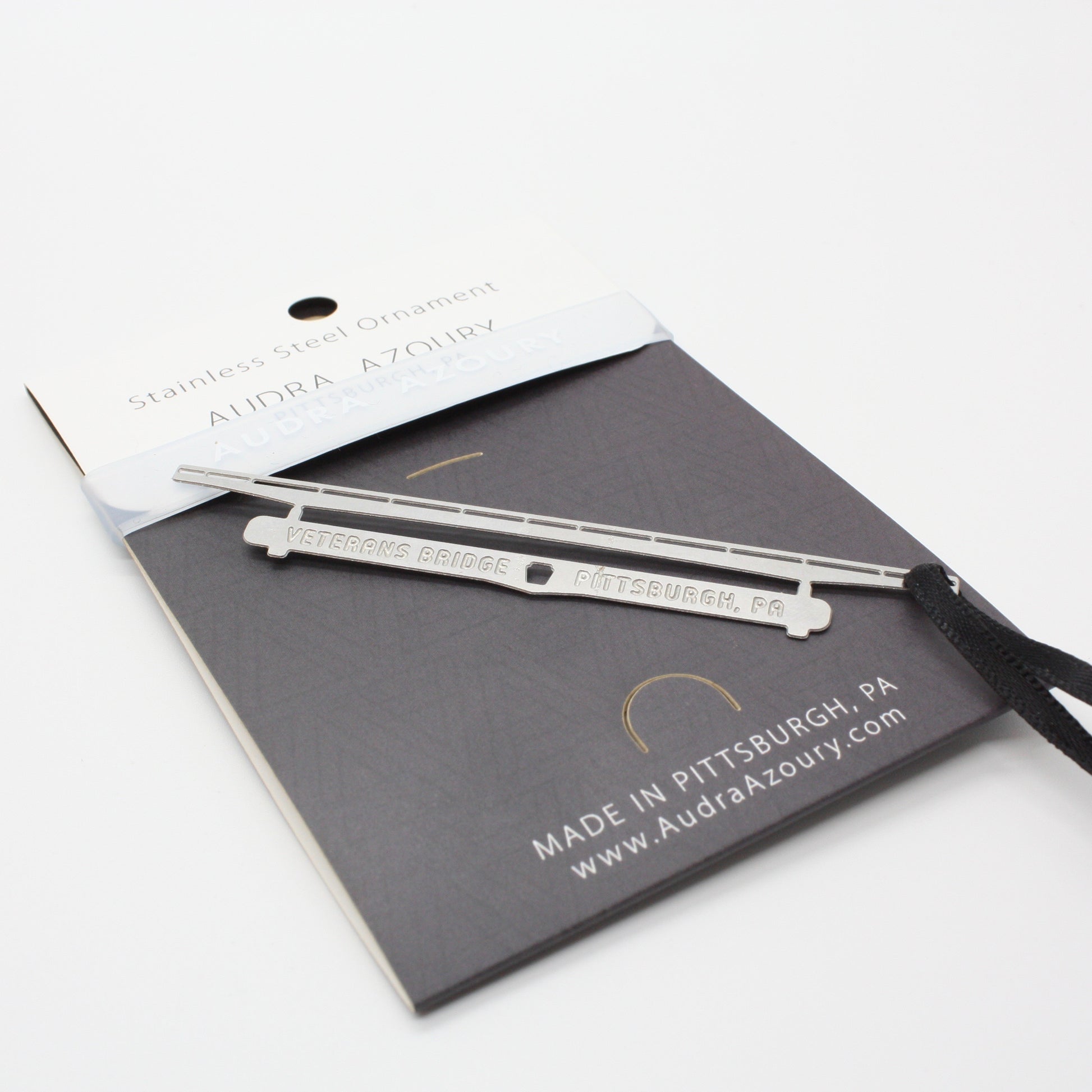 1" x 3 1/2" light weight stainless steel ornaments will not tarnish or break. Designed by Pittsburgh artist Audra Azoury.