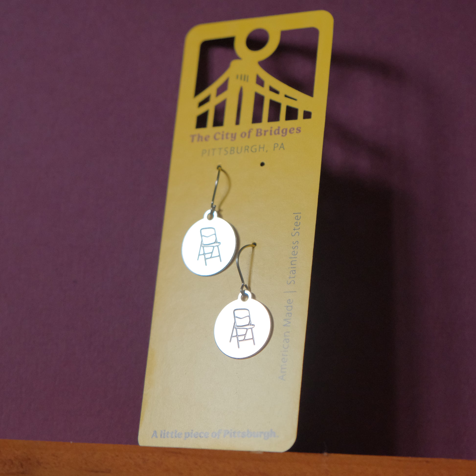 Nothing says winter in Pittsburgh, quite like these Pittsburgh Parking Chair Earrings! It's like wearing a tiny piece of home. Lightweight stainless steel. 1/2" round. Lightweight. Surgical steel ear wires. Designed by local artist Audra Azoury.