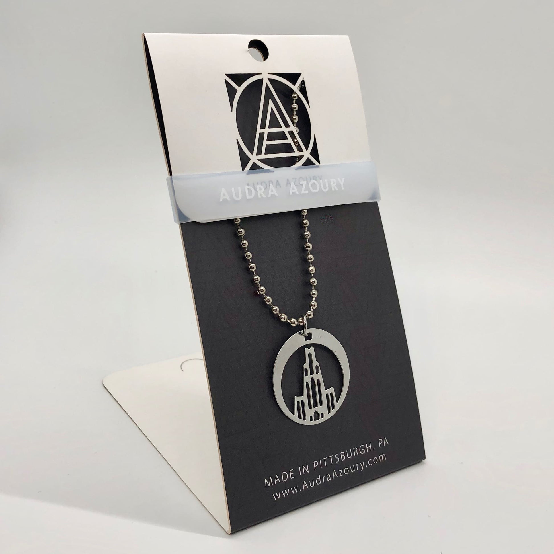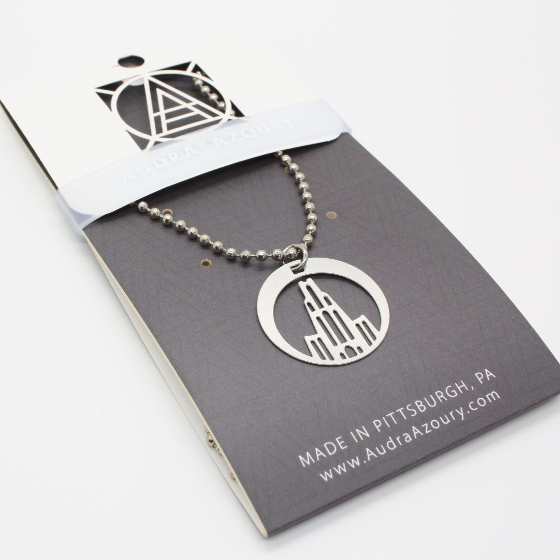 Cathedral of Learning necklace. Lightweight stainless steel charm will not rust or break. Ballchain is 20" in length and can be easily snipped to a shorter length. Designed by local artist Audra Azoury.