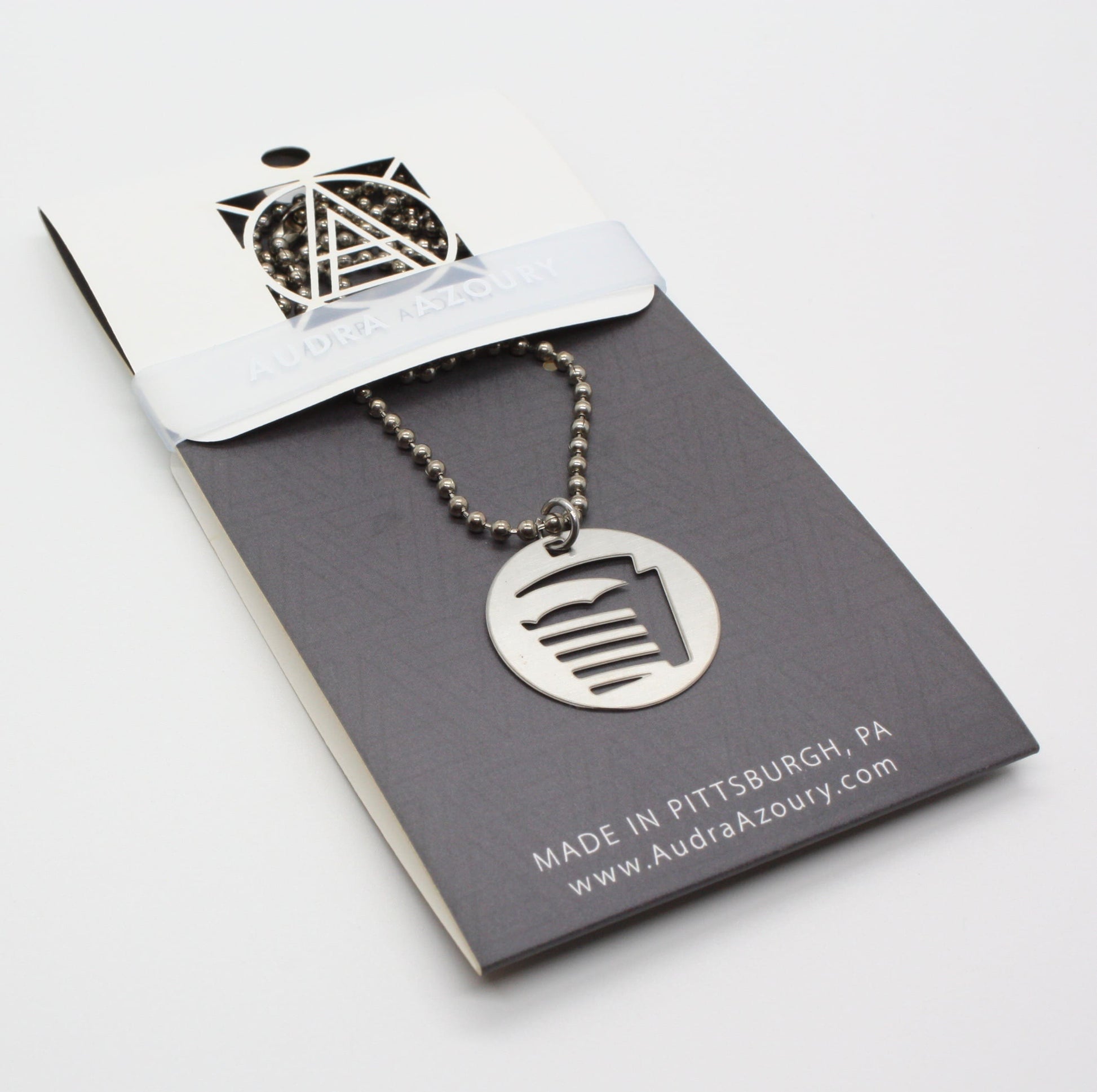 Pittsburgh Steel Town Necklaces are inspired by Pittsburgh sports, bridges and landmarks. Lightweight stainless steel charm will not rust or break. Ballchain is 20" in length and can be easily snipped to a shorter length. Designed by local artist Audra Azoury.