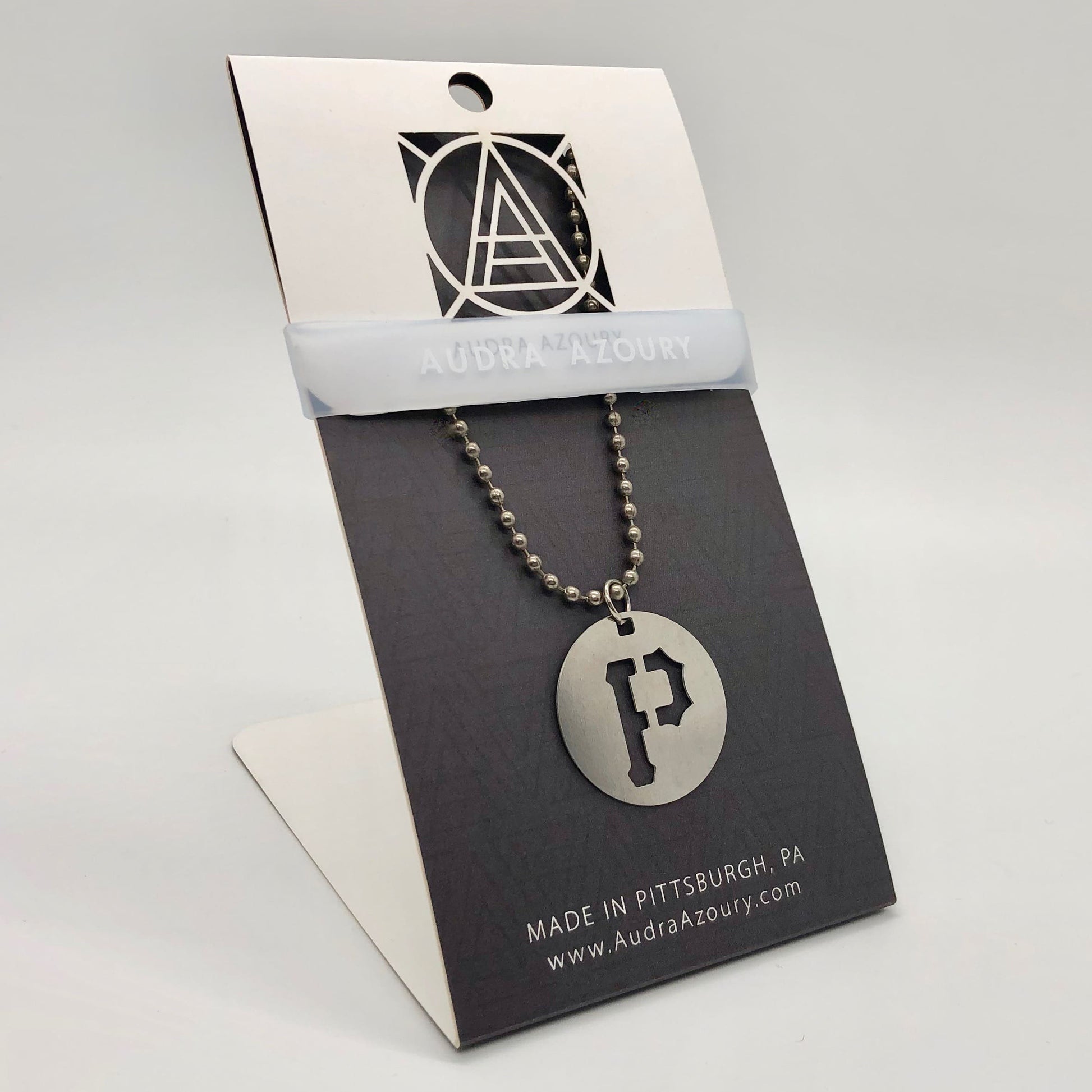 Pittsburgh Pirates P Necklace. Lightweight stainless steel charm will not rust or break. Ballchain is 20" in length and can be easily snipped to a shorter length. Designed by local artist Audra Azoury.