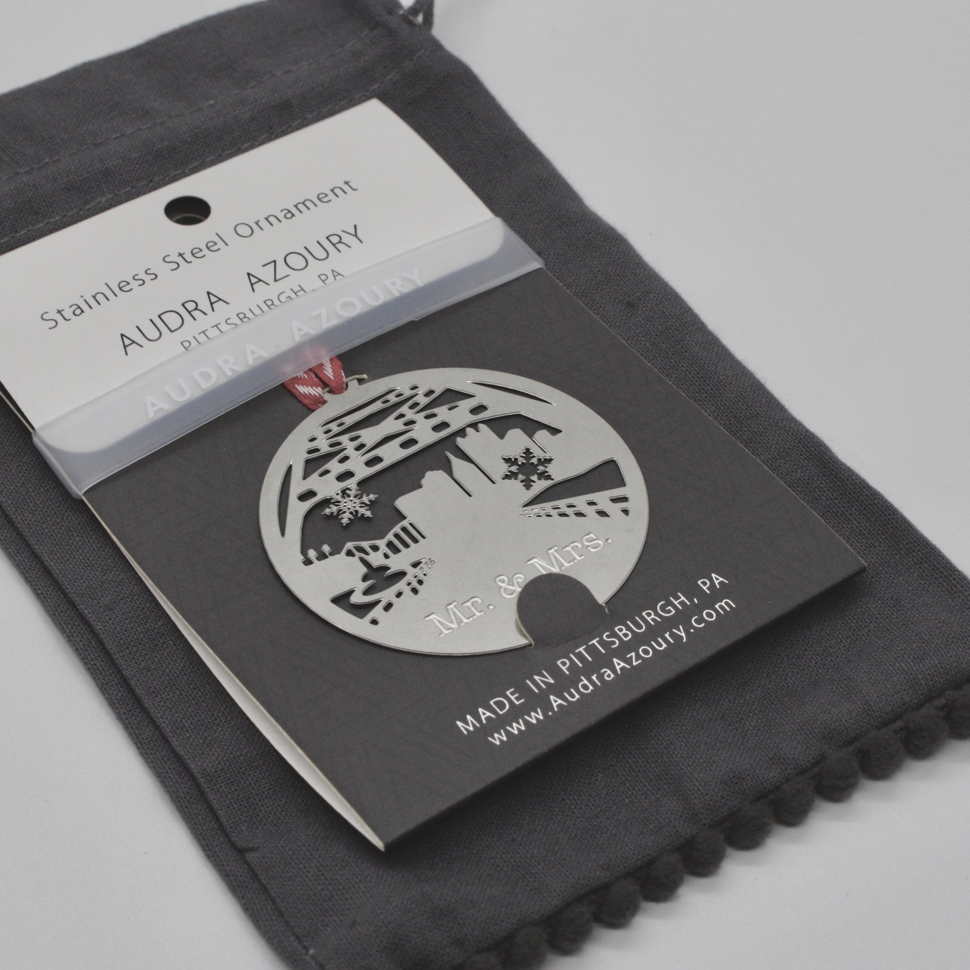 Mr. & Mrs. Just Married Pittsburgh Design Ornament is the perfect gift for the newlyweds! 2" round and made from lightweight stainless steel.