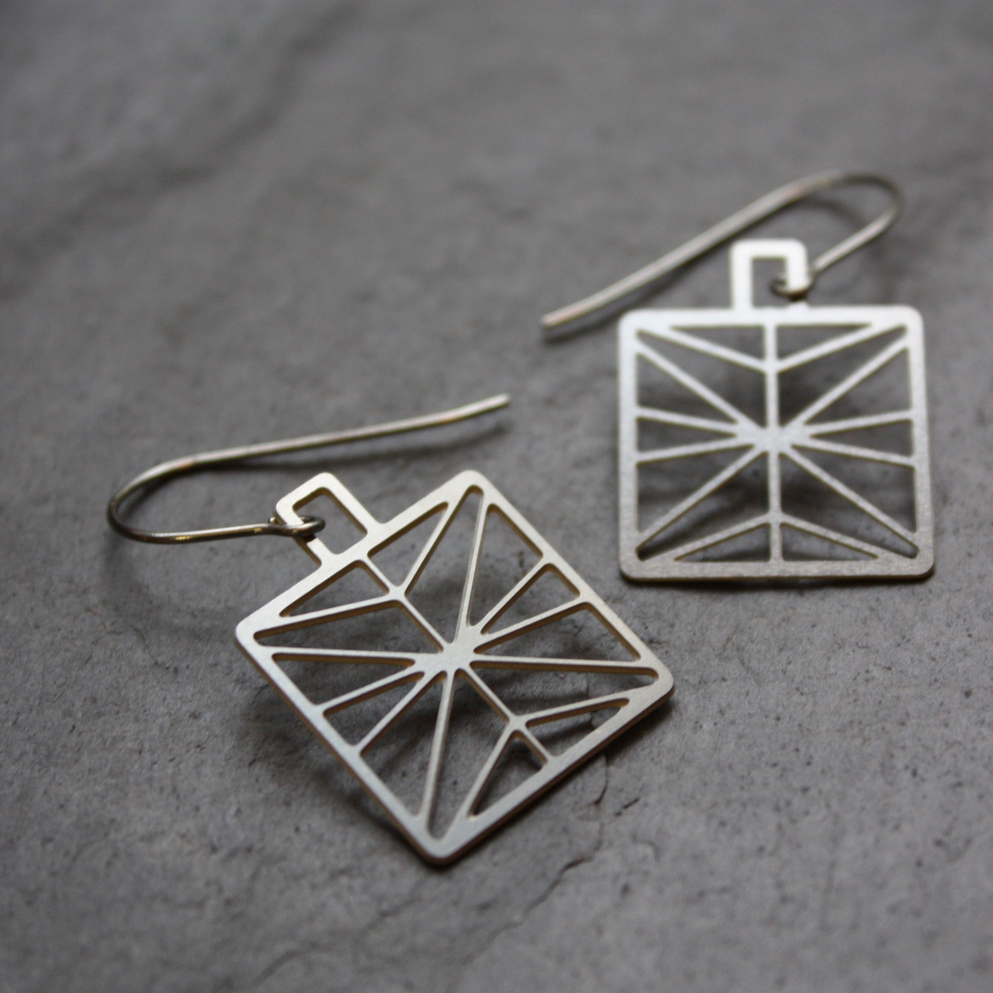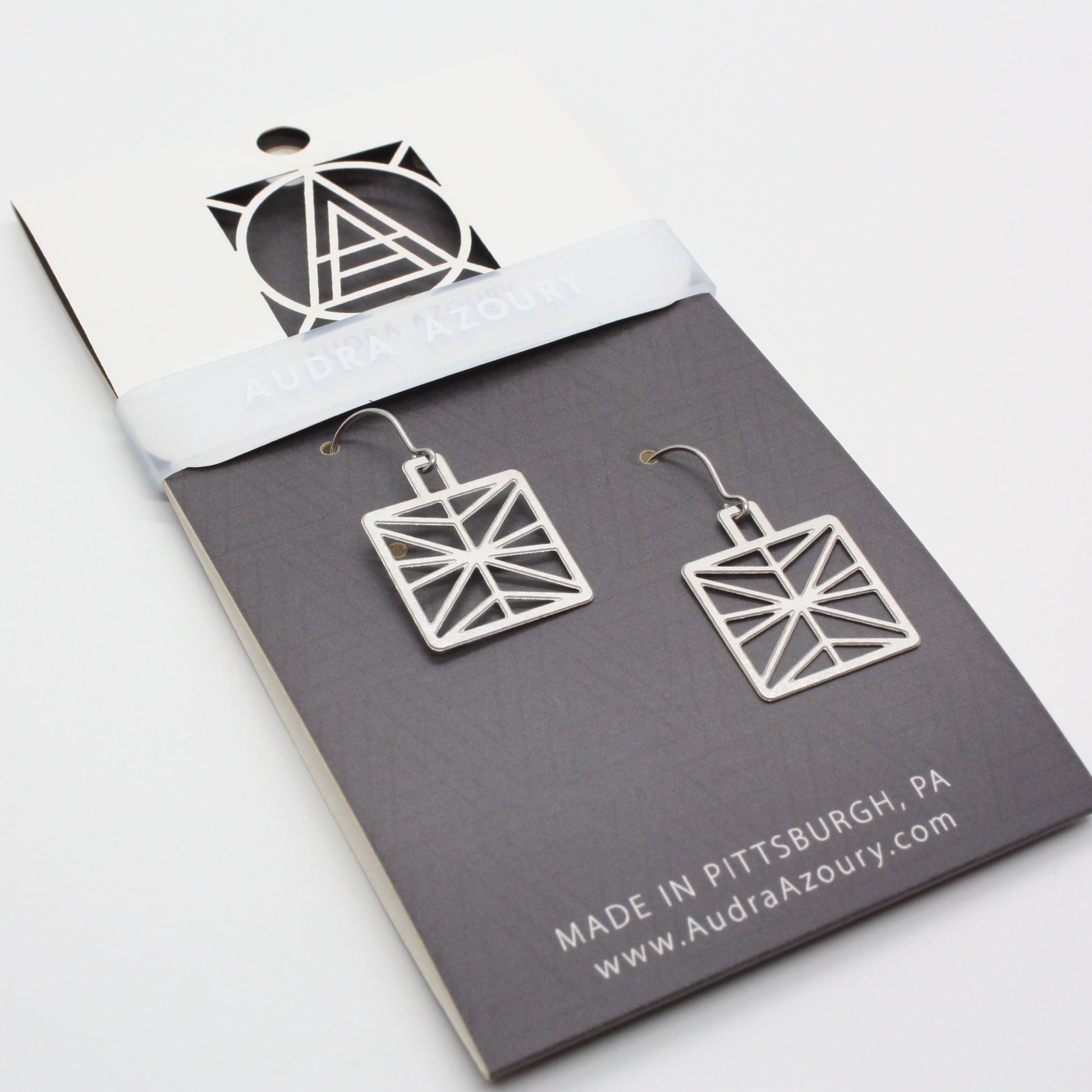 3/4" square. Lightweight stainless steel will not tarnish. Ear wires are surgical steel. Designed by Pittsburgh artist Audra Azoury.